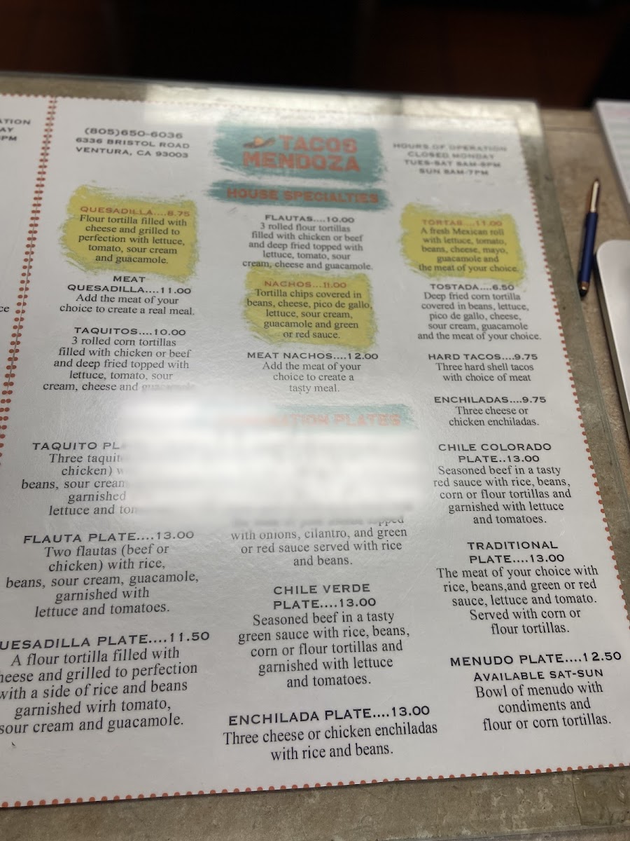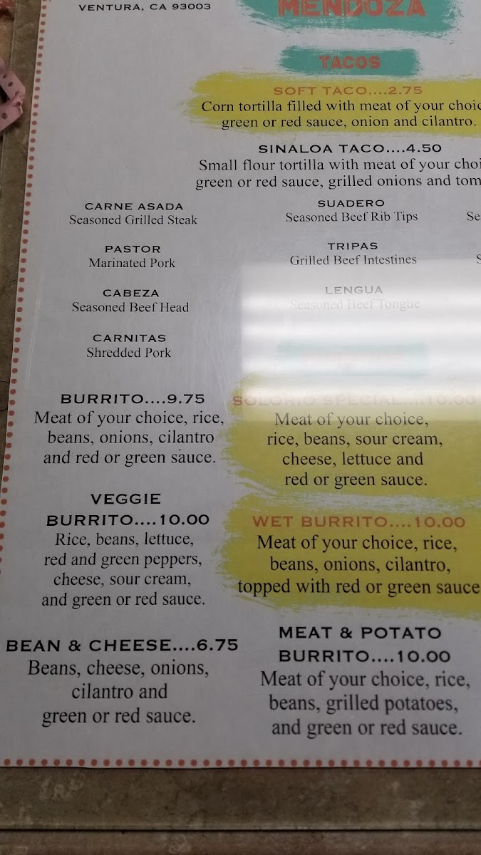 The meat of your choice, rice, beans, onions and cilantro with green or red hot sauce, topped off with green or red hot sauce